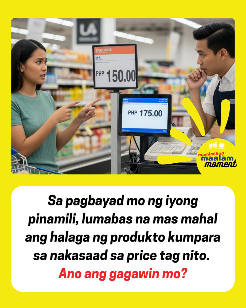 Gayundin naman, tungkulin nating ipaabot ang price discrepancy sa tindera o manager upang magawan ng aksyon. Kung hindi pa rin ito ayusin ng tindahan, maaaring maghain ng pormal na reklamo sa Department of Trade and Industry (DTI). Mahalagang mayroong kopya ng resibo at, kung posible, ang litrato ng price tag bilang ebidensya.