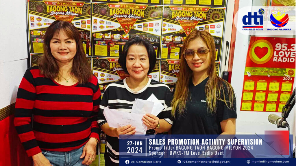 𝗗𝗔𝗘𝗧, 𝗖𝗔𝗠𝗔𝗥𝗜𝗡𝗘𝗦 𝗡𝗢𝗥𝗧𝗘 – Last 27 January 2024, the Department of Trade and Industry – Camarines Norte Provincial Office supervised the sales promotion activity entitled Bagong Taon Bagong Milyon 2024 Raffle Draw at Love Radio Daet.